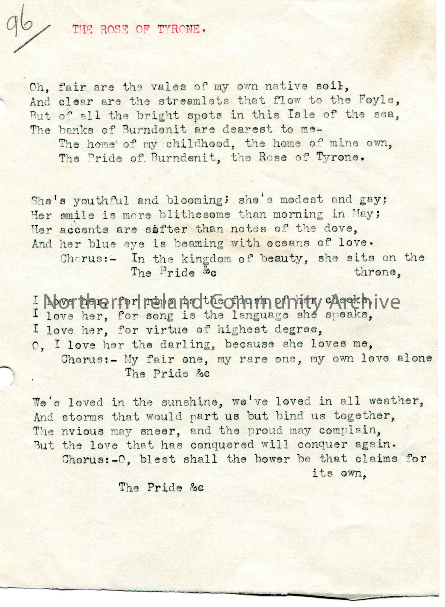 Typed words to song, four verses, titled, ‘The Rose of Tyrone’.