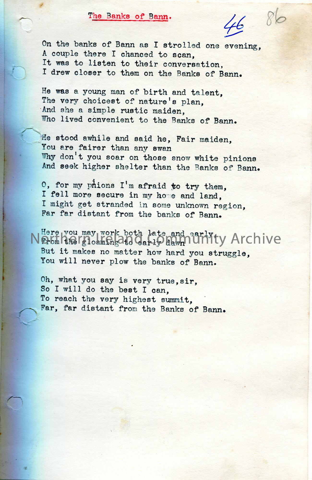 Typed words to song titled, ‘The Banks of Bann’.