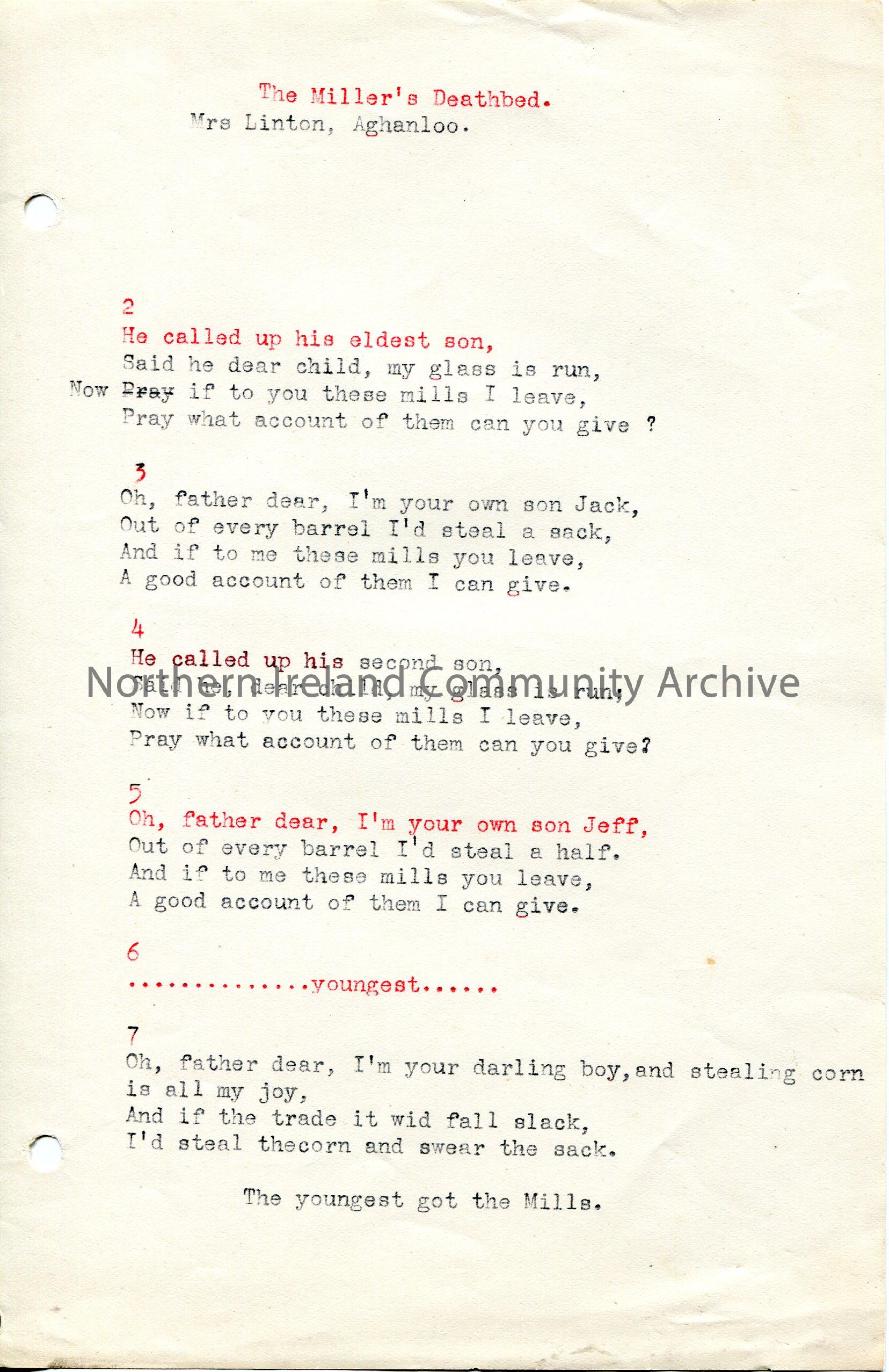 Typed words to song titled, ‘The Miller’s Deathbed’. Mrs Linton, Aghanloo.