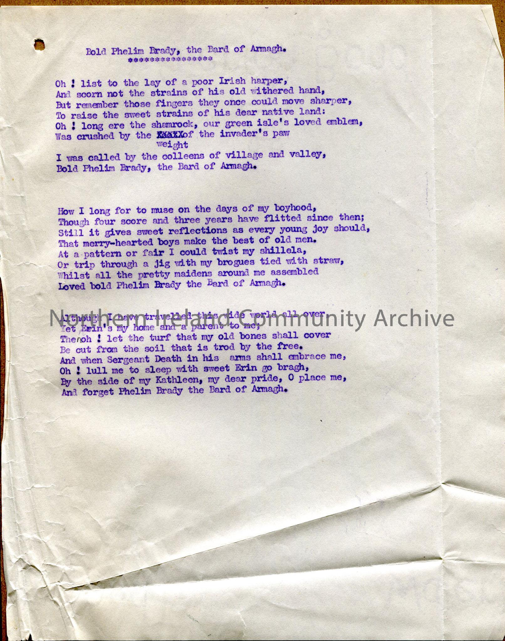 Typed words to song, under heading of ‘Bold Phelim Brady, the Bard of Armagh’ – he is the subject of the song.