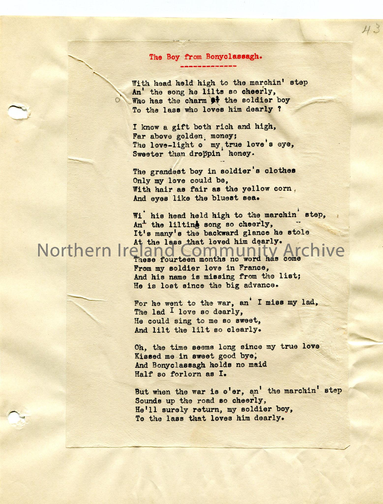 Typed words to 'The Boy from Bonyclassagh'. Uses local dialect. Page from loose manuscript of Rowlock Rhymes and Songs of Exile- a book of verse edited by Sam Henry. The author, Robert McMullan from Portballintrae, had the pen name 'North Antrim' and was "imbued with the Celtic spirit" and interested in the fishermen of the north coast of Antrim
