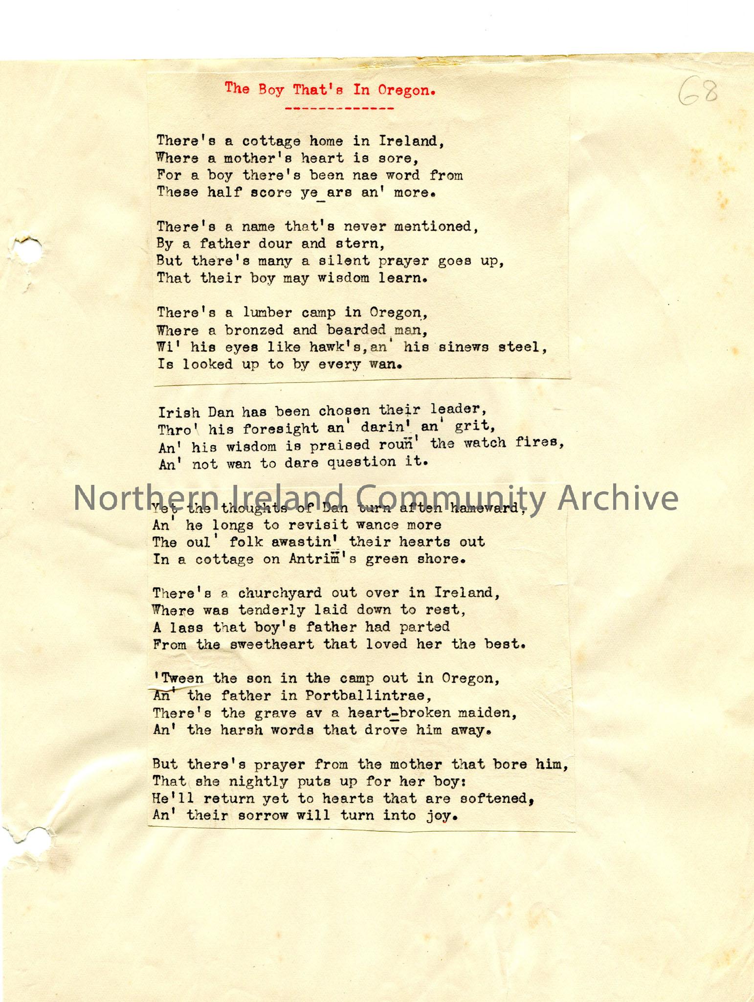 Typed words to 'The Boy that's in Oregon' affixed to page. Mentions Portballintrae. Page from loose manuscript of Rowlock Rhymes and Songs of Exile- a book of verse edited by Sam Henry. The author, Robert McMullan from Portballintrae, had the pen name 'North Antrim' and was "imbued with the Celtic spirit" and interested in the fishermen of the north coast of Antrim