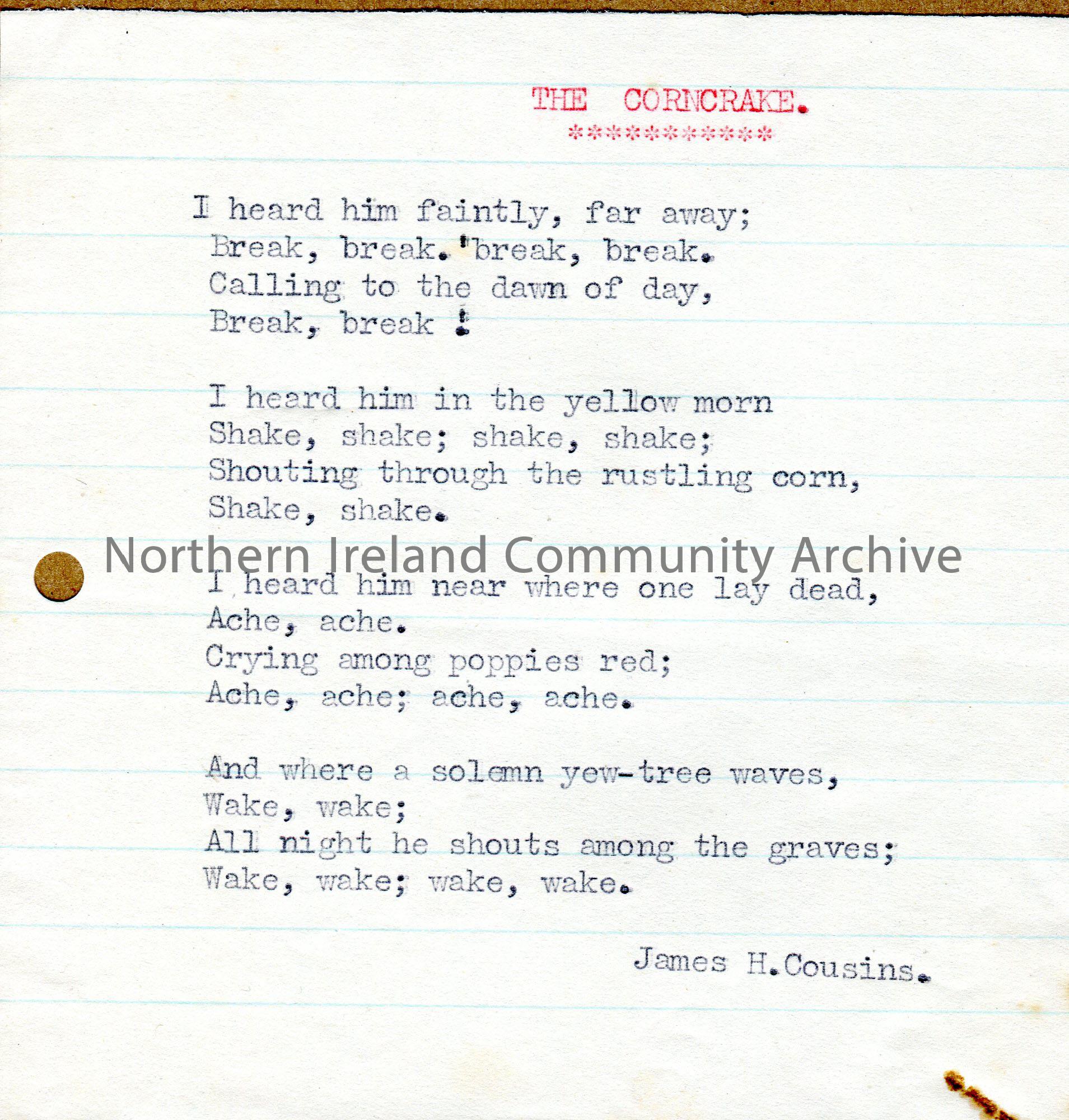 Typed words to ‘The Corncrake’. Poem mentions graves and red poppies