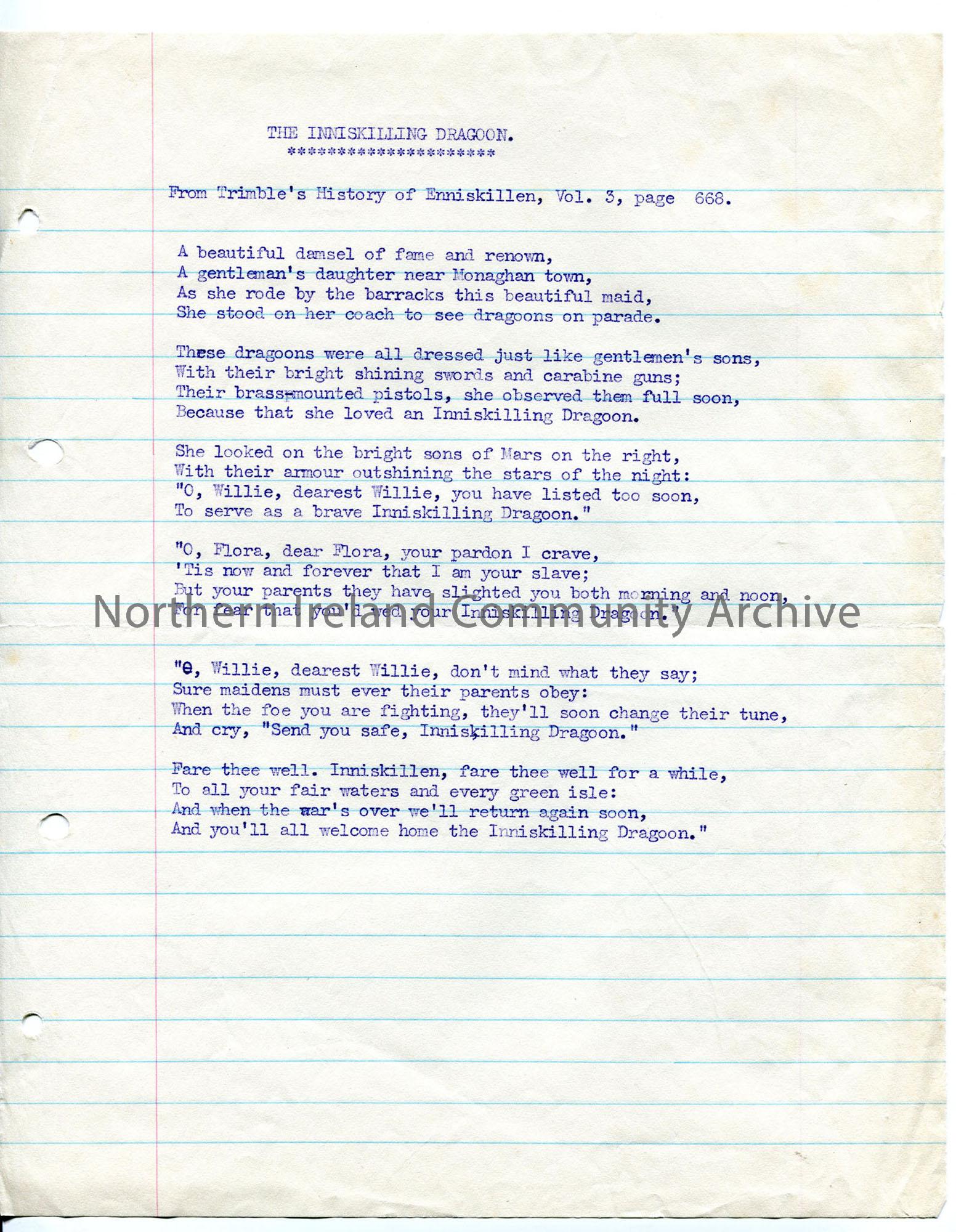 Typed words to ‘The Inniskilling Dragoon’, taken from Copeland Trimble’s ‘History of Enniskillen’