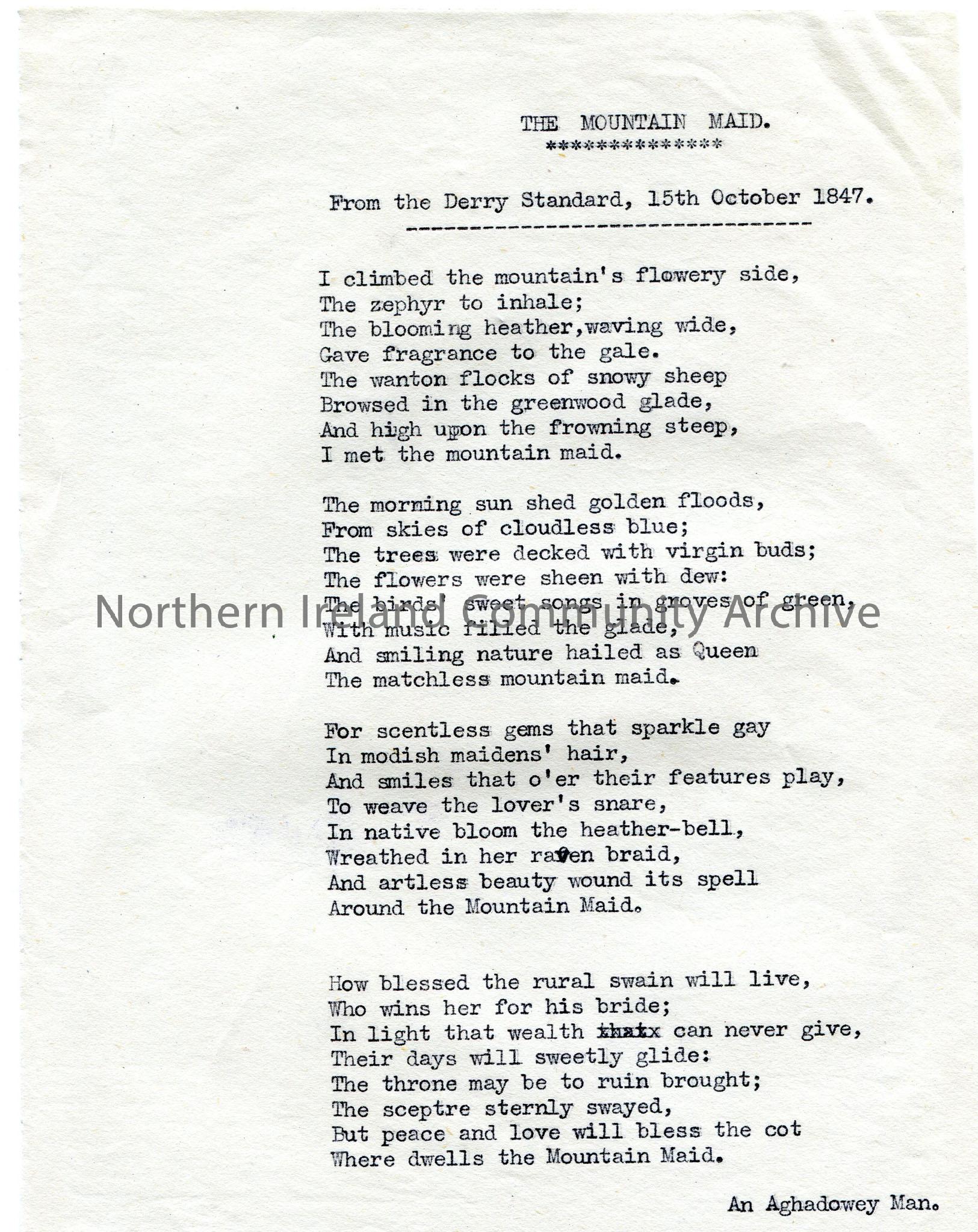 Typed words to ‘The Mountain Maid’, signed ‘An Aghadowey Man’.