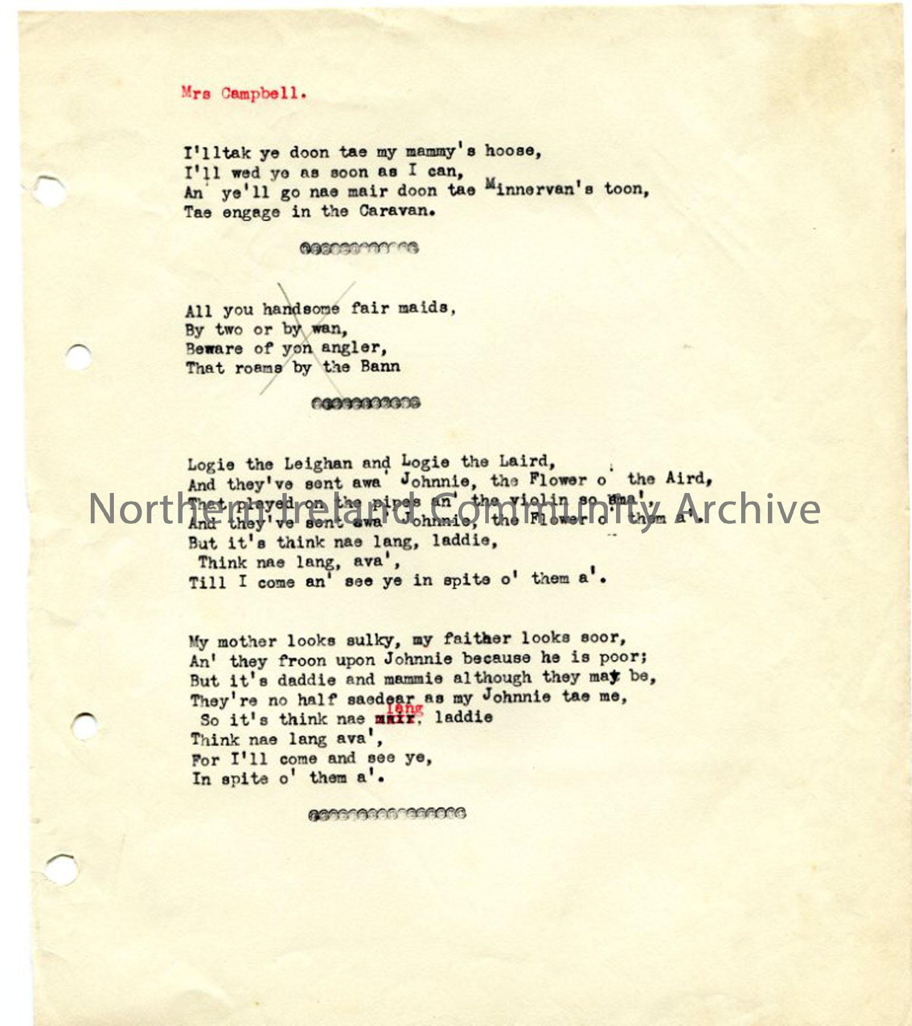 Typed words to untitled poem. Possibly from Mrs Campbell.