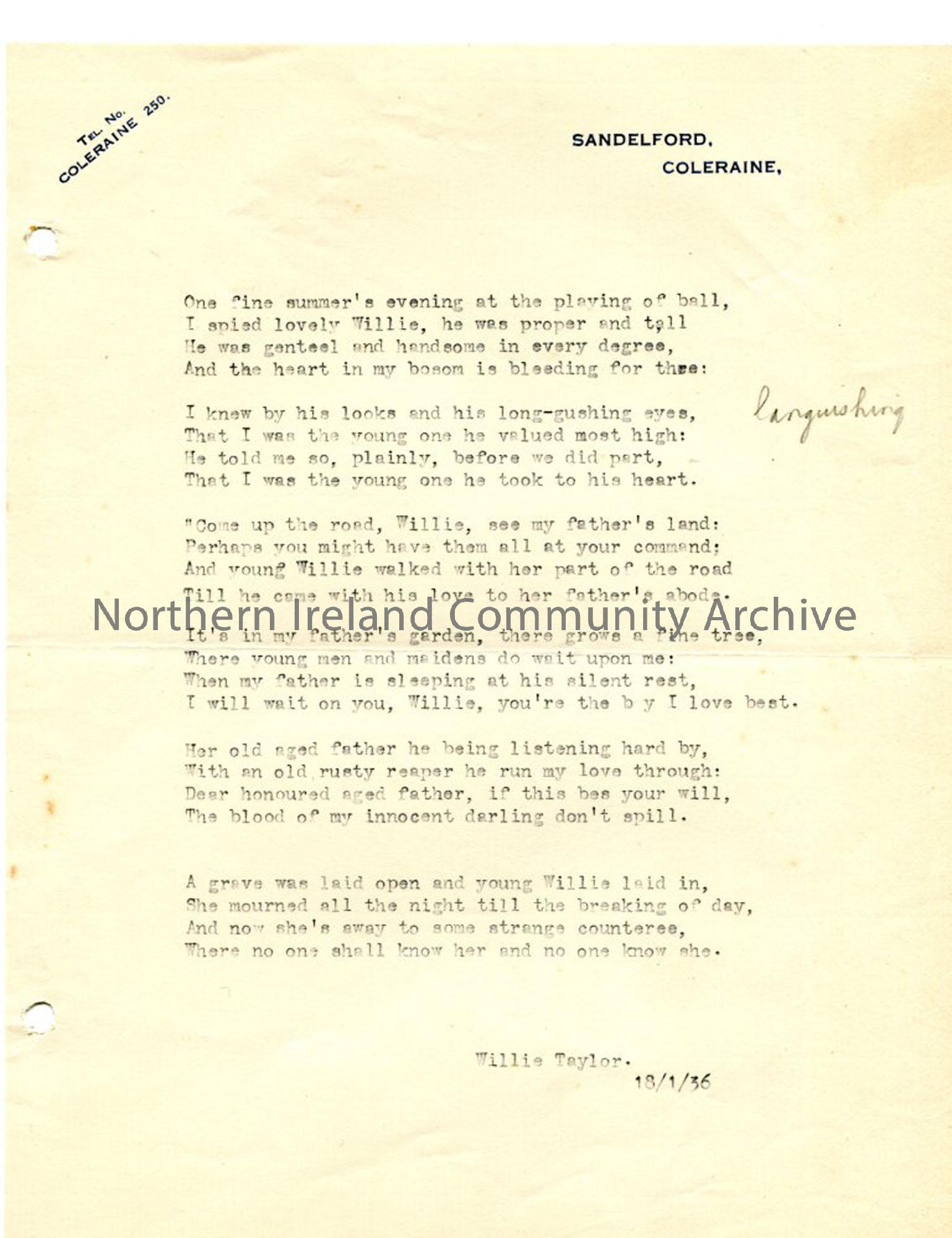 Typed words to untitled poem. From Willie Taylor, 18.1.1936.