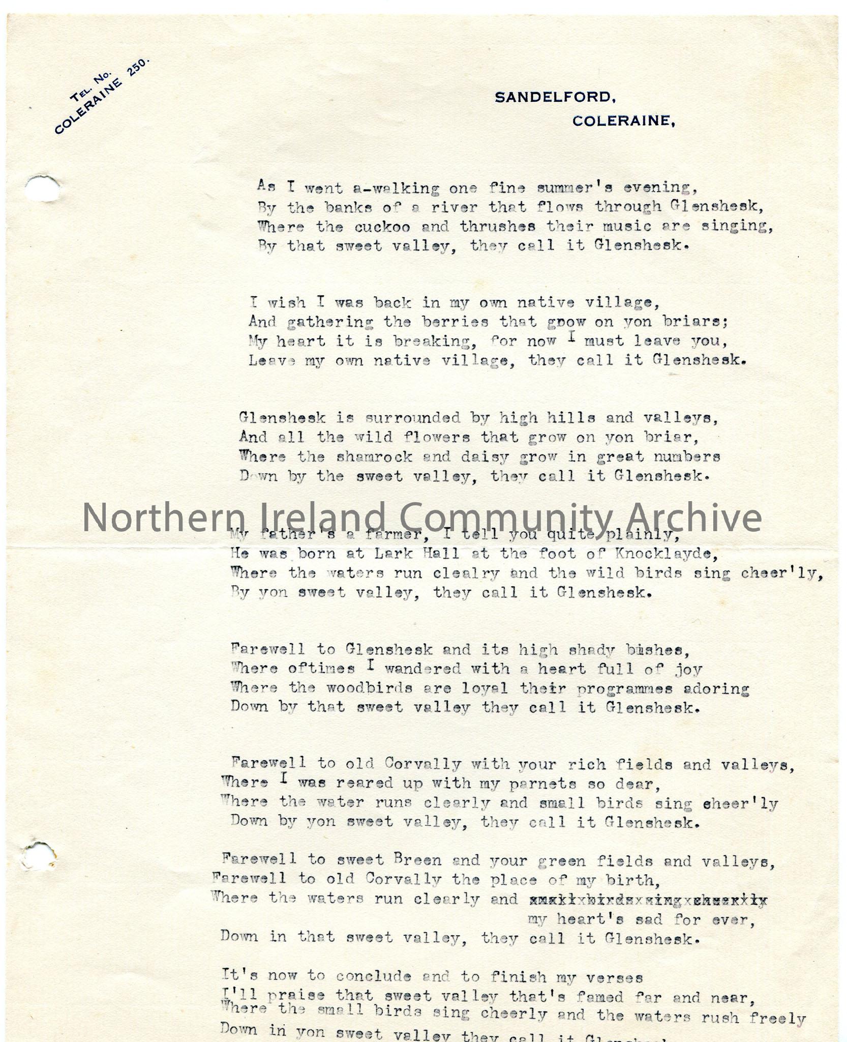 Typed words to untitled poem. Mentions Glenshesk, Knocklayde, Corvally.