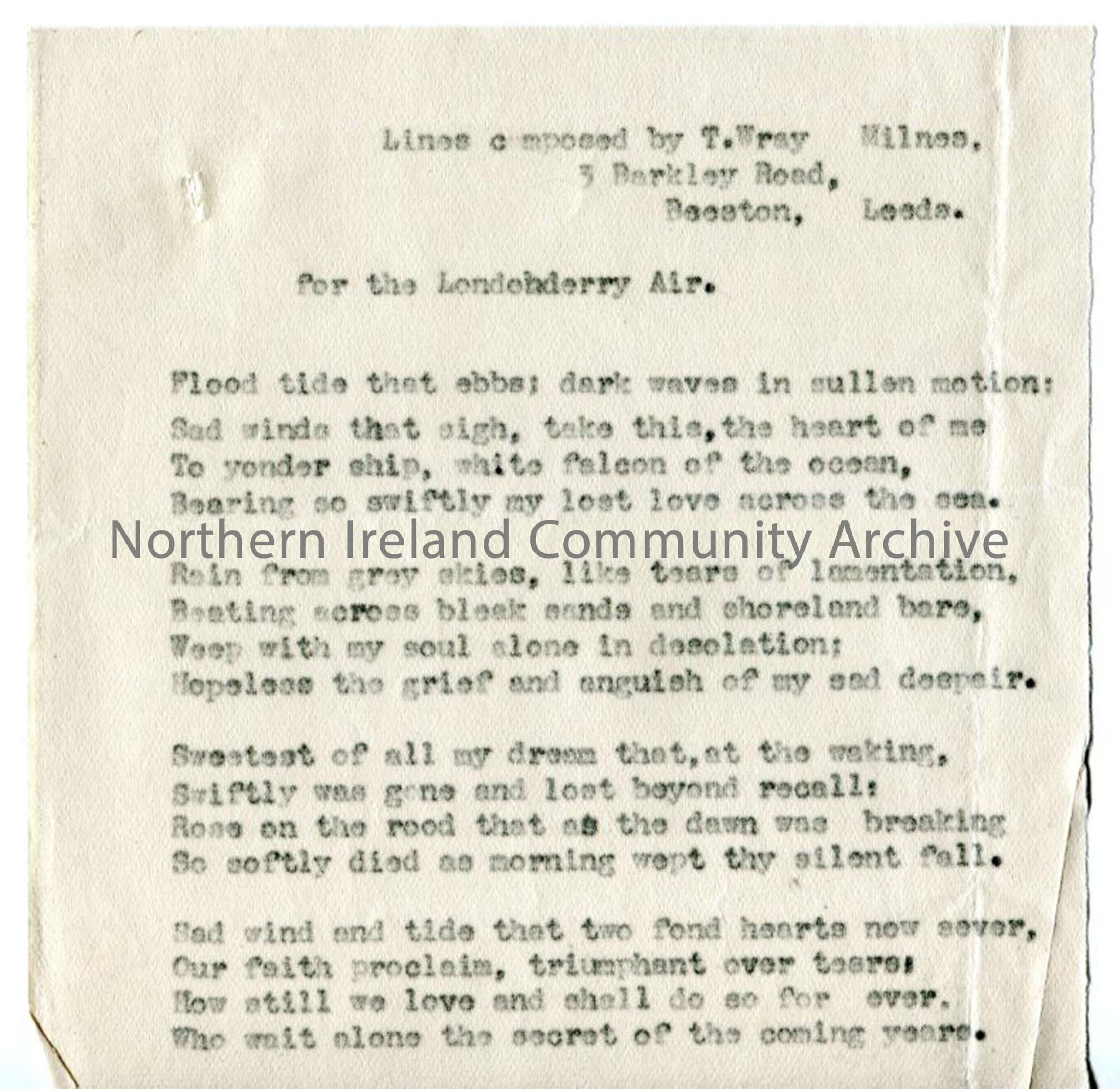 Typed words to untitled song 'for the Londonderry Air'. By T Wray Milnes, Beeston, Leeds.
