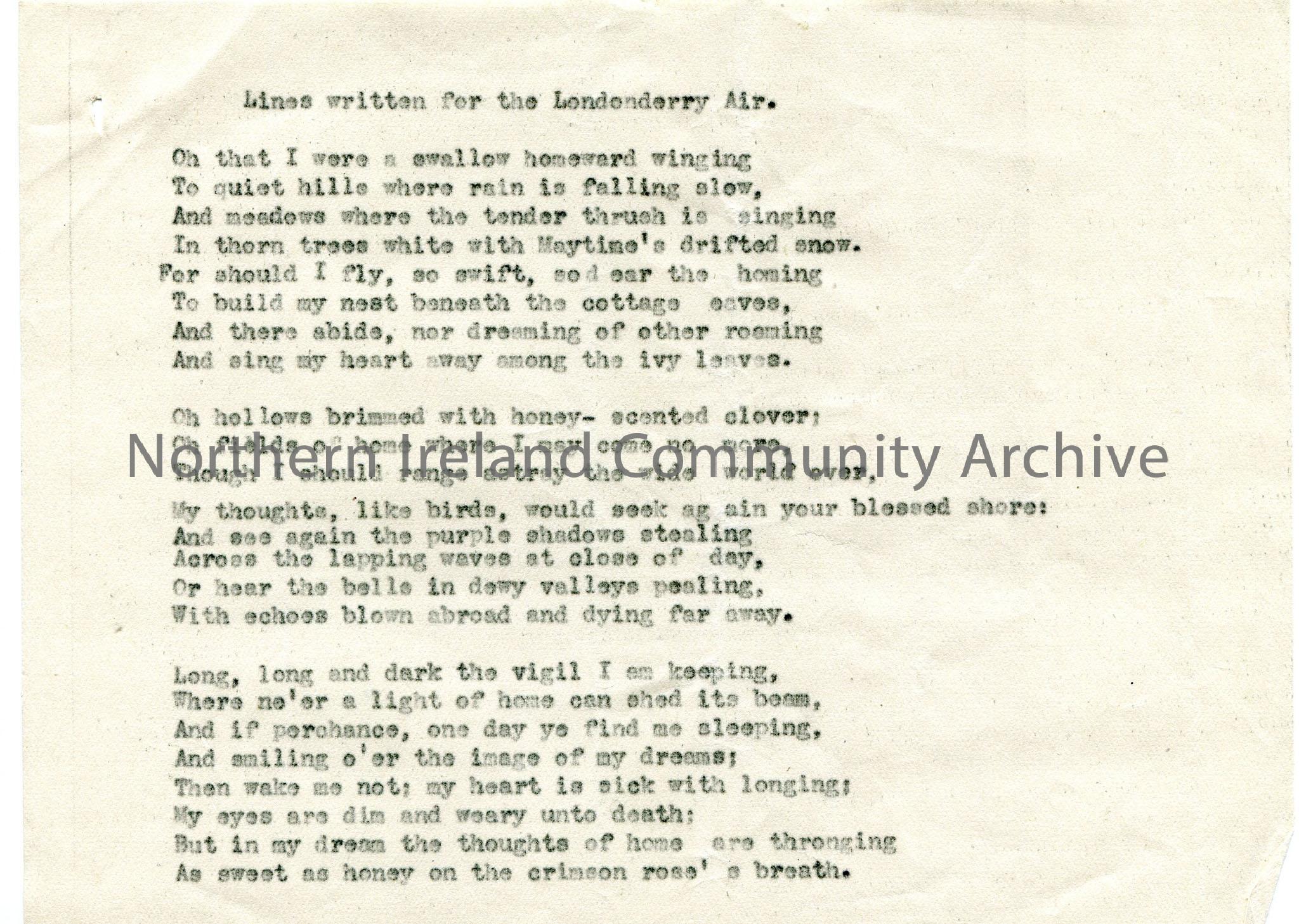Typed words to untitled song written for ‘The Londonderry Air’