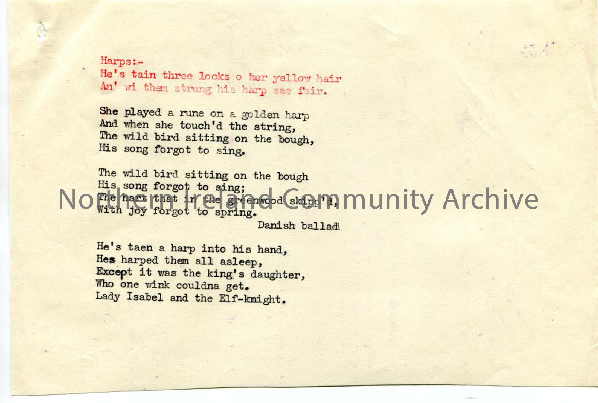 Typed words to untitled song, with 'harps' indicated in red.
