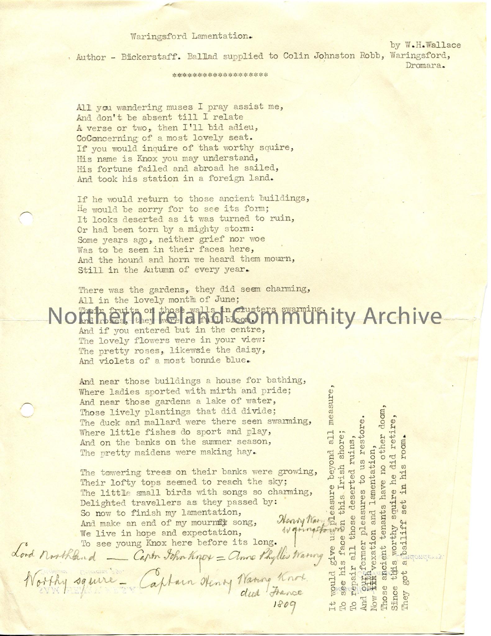 Typed words to ‘Waringsford Lamentation’, with pencilled in notes re family line of Knox