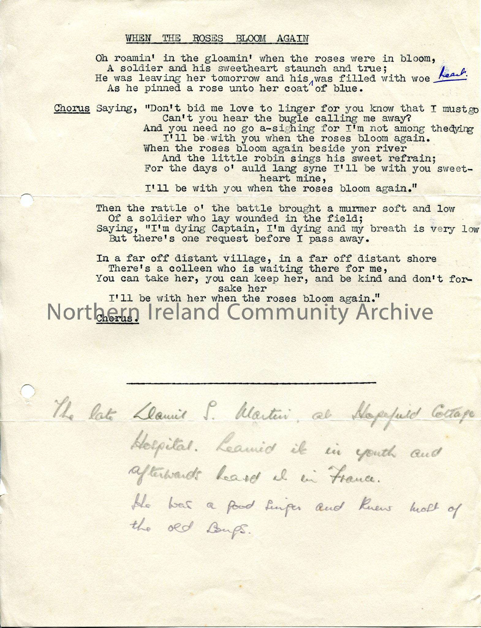 Typed words to ‘When the Roses Bloom Again’, with handwritten notes re ? donor and where he learned song. Uses local dialect.