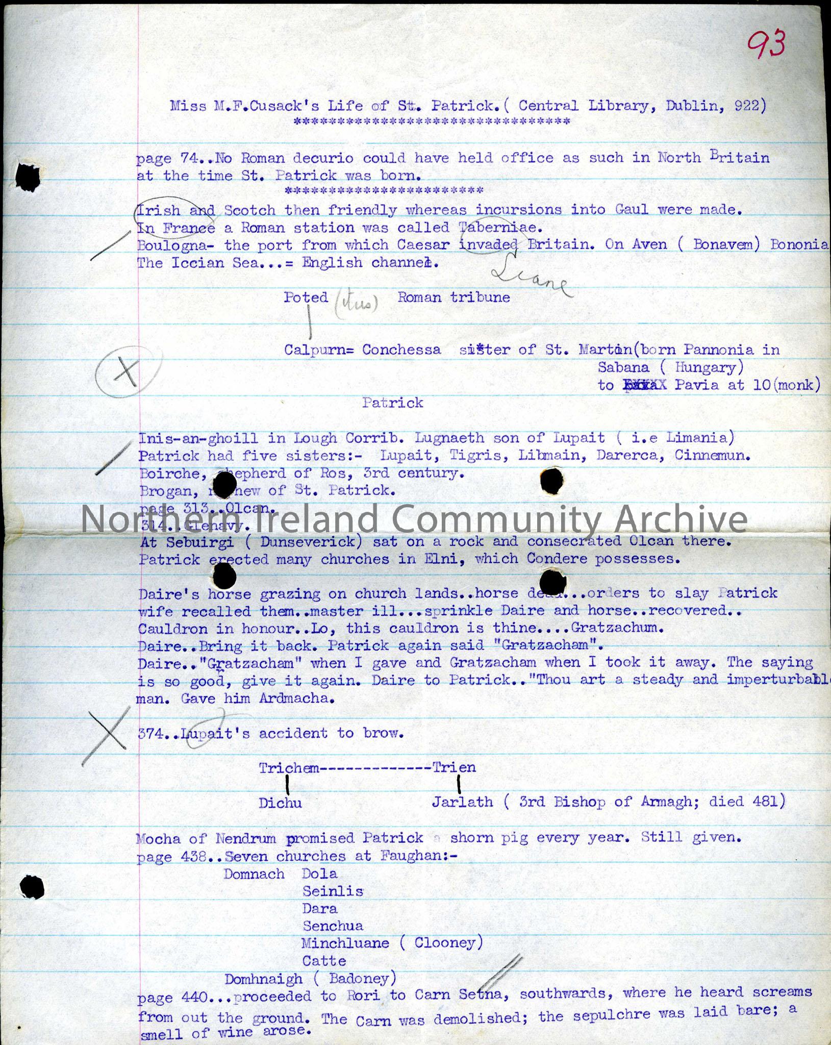 Types notes, titled ‘Miss M.F.Cusack’s Life of St.Patrick. (Central Library, Dublin, 922)’.