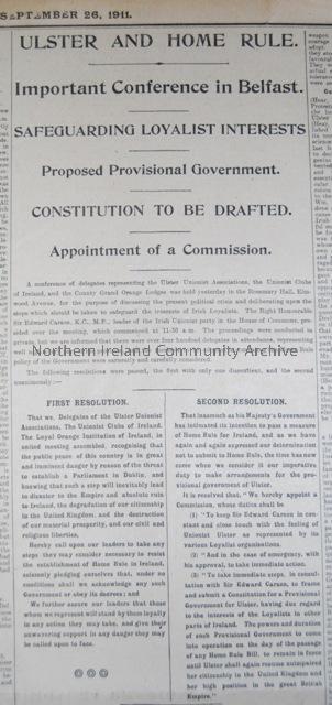 Article printed in the Belfast Newsletter, 26/09/1911 about a conference in Belfast discussing the protection of Loyalists in Home Rule.