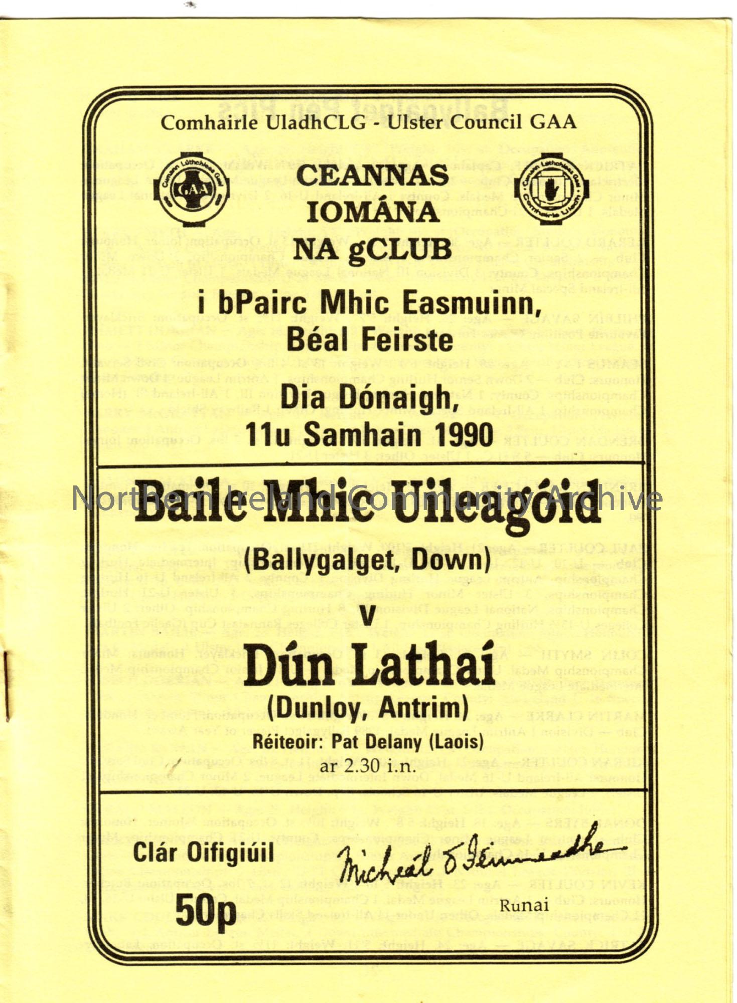 Ulster Club Hurling Championship Final. Ballygalget, Down v Dunloy Cuchullains at Casement Park. 11th November 1990