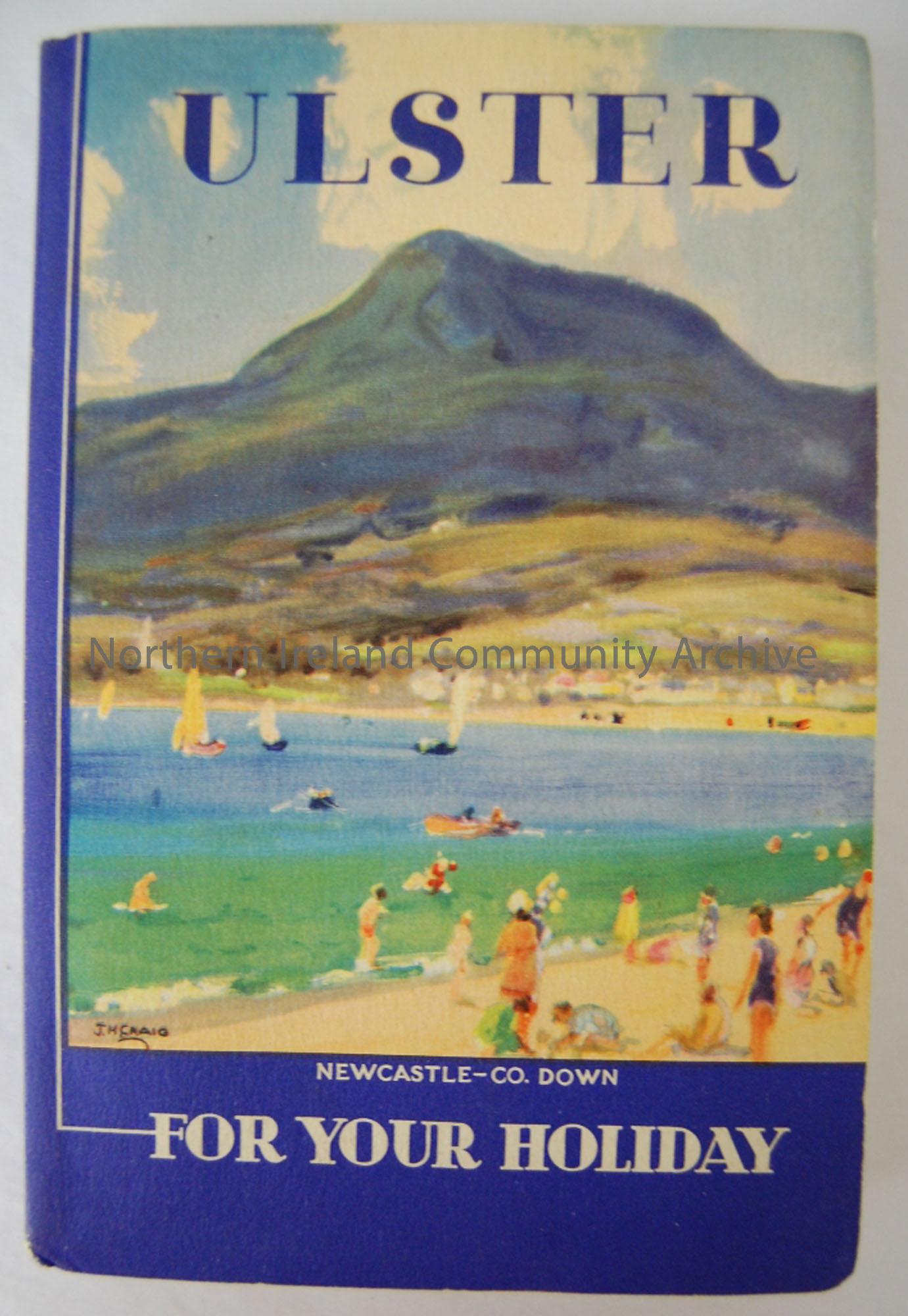 'Ulster for your holiday' c.1939.Cover has blue background, with colour watercolour illustrations of Newcastle, Co.Down (front) and Larne (back). Book contains 288 pages, with maps and photographs and brief description of the major towns and tourist spots.