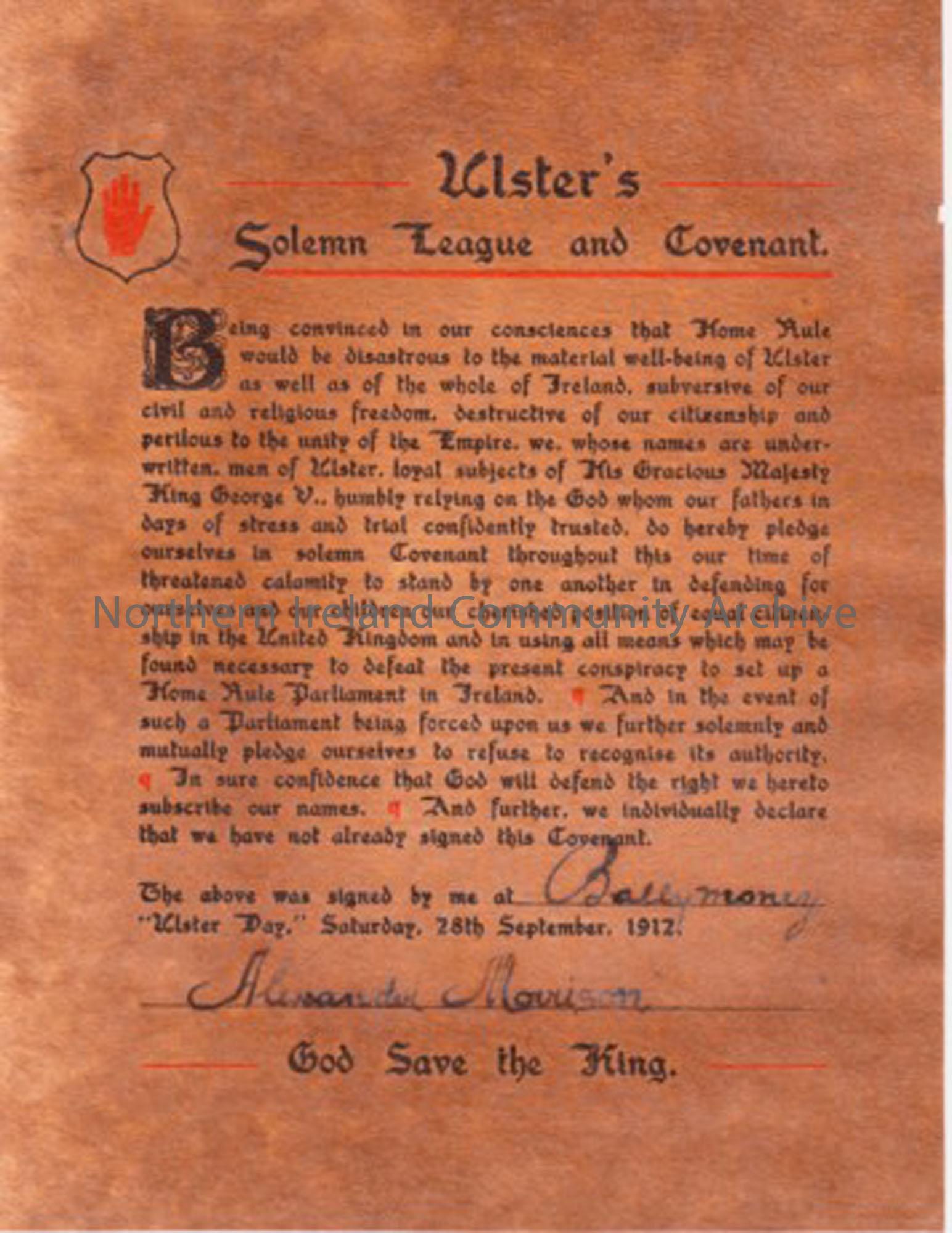 Ulster’s Solemn League and Covenant, signed at Ballymoney on 28th September 1912, by Alexander Morrison