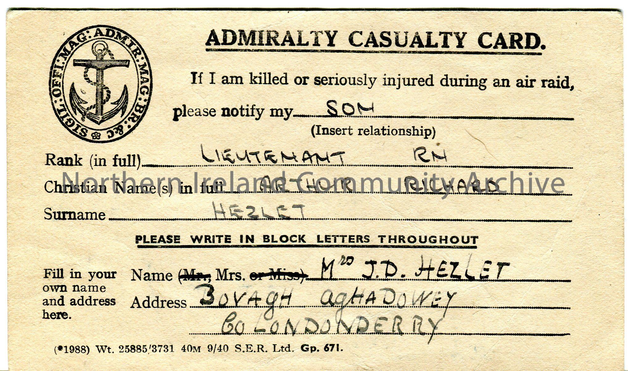 Undated Admiral Casualty Card of Mrs J D Hezlet [Dorothy], giving son Lieutenant Arthur as person to be notified in case of air raid injury/death