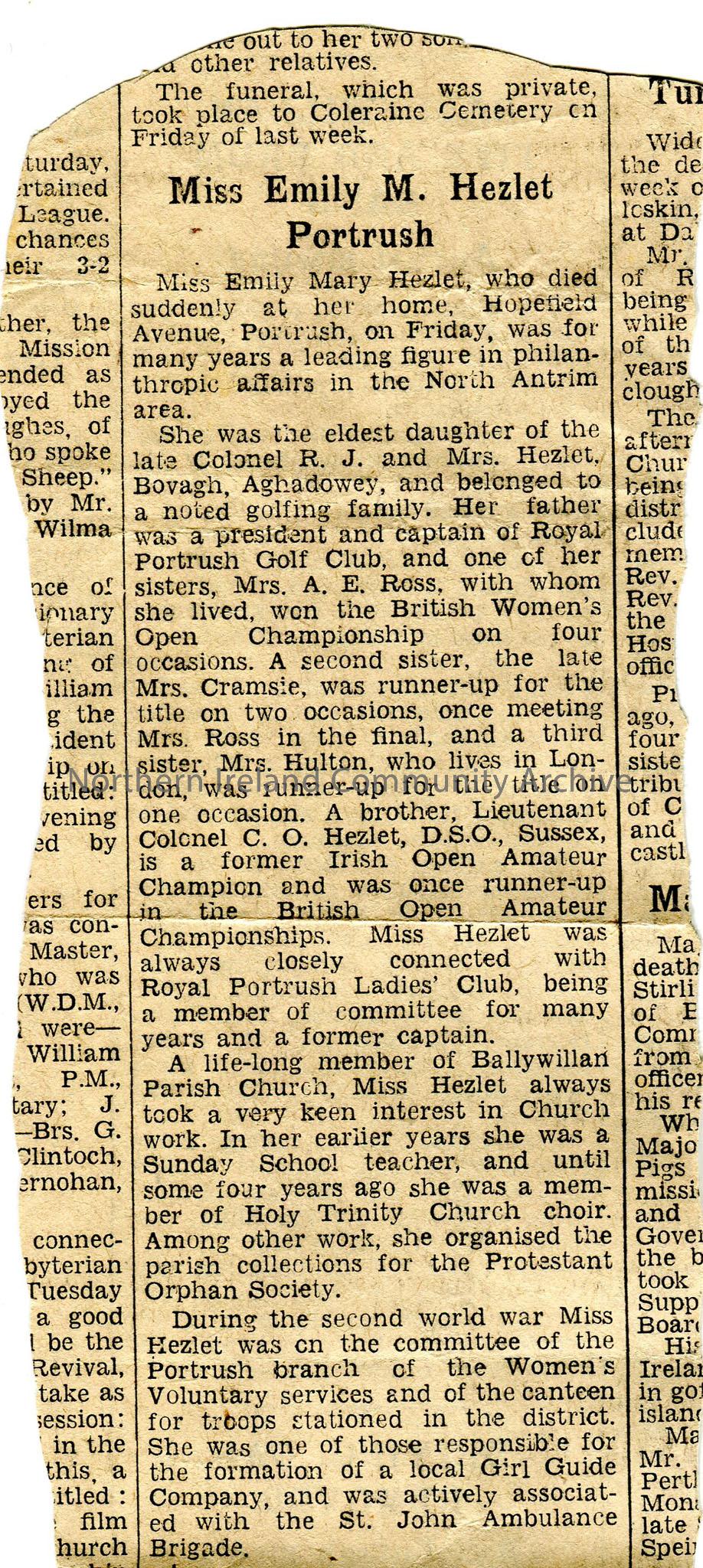 Undated newspaper article – Obituary of Emily Hezlet. Outlines golfing prowess in family and Emily’s charitable works