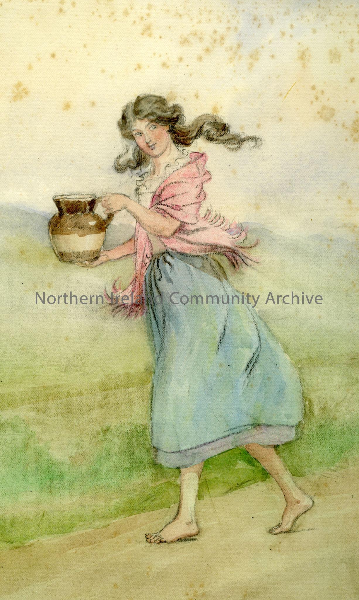 artwork titled, 'unidentified girl carrying jug' by Hugh Thomson. This is an unpublished work. Girl walking, carrying jug along hillside. Unidentified by Mrs Thomson.