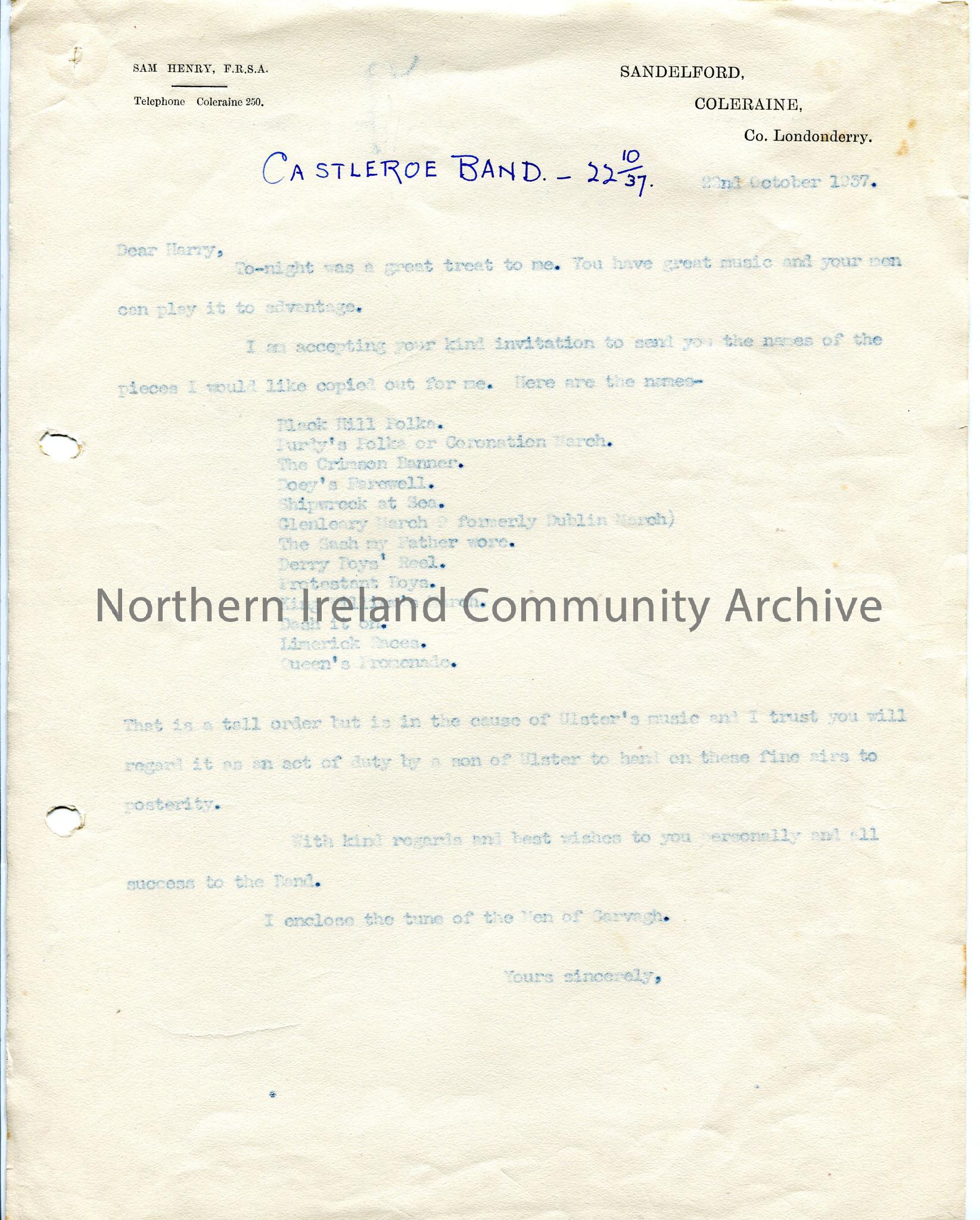 Unsigned, typed carbon copy of letter to Castleroe band re evening spent with them and request for words to songs