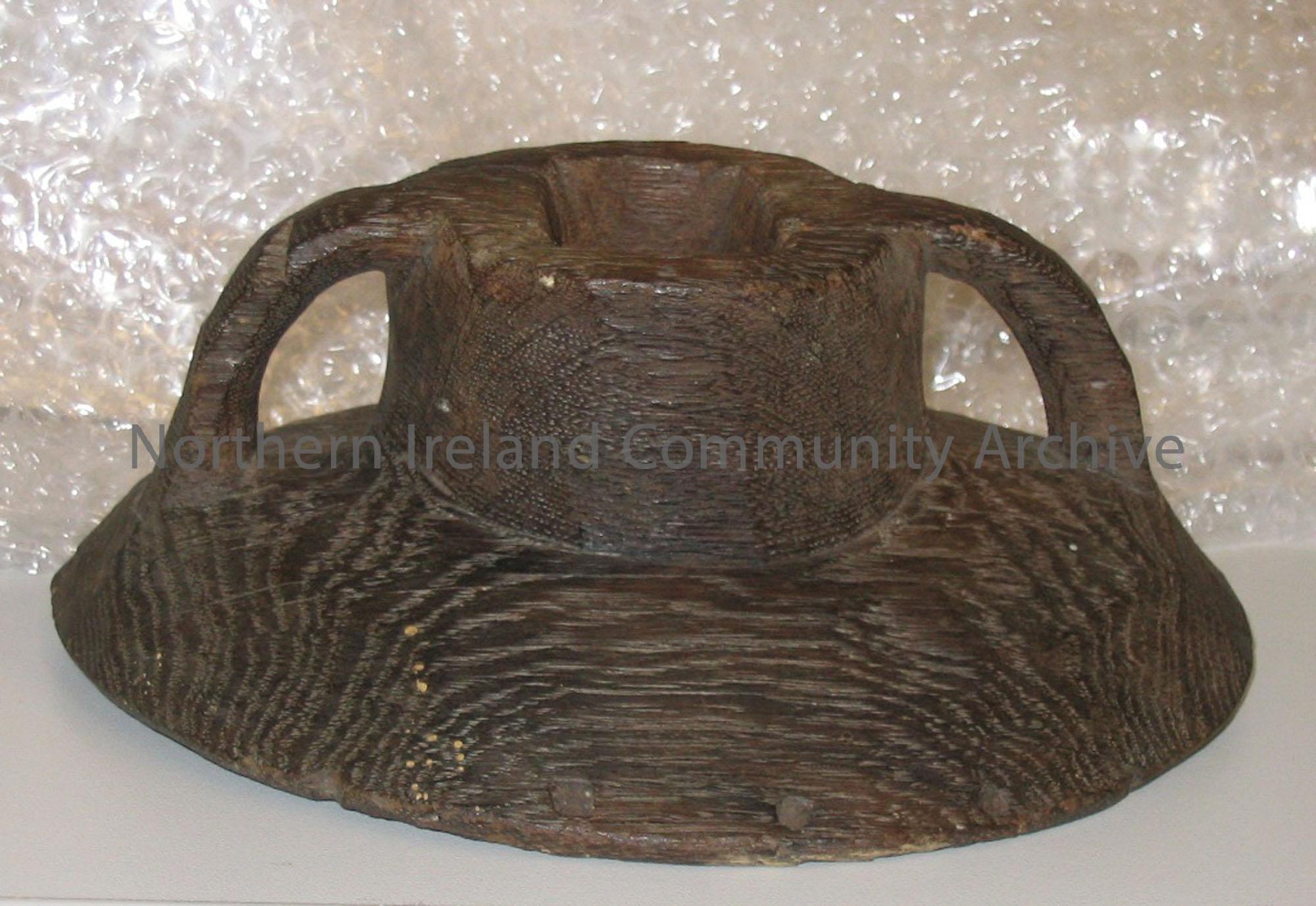 Vessel lid. Circular base with round neck and two handles joined to base and neck.There is a square hole pierced through the neck and base.