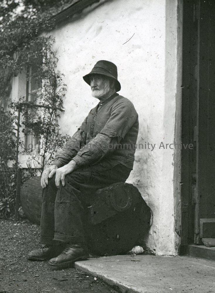 Elderly man sitting on log at door of white cottage - Ballynure