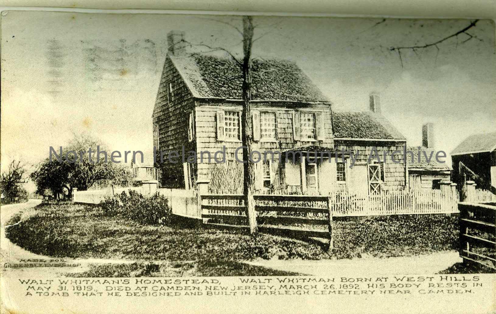 Visits to Walt Whitman. 2 postcards, of Walt Whitman's Long Island homestead, from Margaret, Sam's sister, in 1922 - black and white affixed opposite p68 and colour on p117.