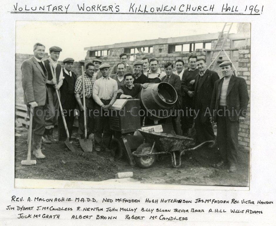Voluntary Workers, Killowen Church Hall, 1961; Rev. A. Maconachie M.A.D.D, Ned McFadden, Hugh Hutchinson, Jas. McFadden, Rev. Victor Hanson, Jim Dysart, J.McCandless, R. Newton, John Molloy, Billy Sloan, Trevor Barr, A. Hill, Willie Adams, Jock Albert Bro