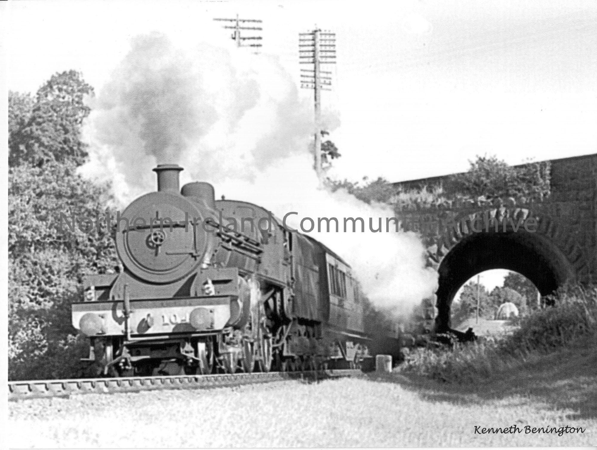 W class 2-6-0 No.104 travels under the main Ballymoney to Ballymena road at the Dry Arch with an early morning Derry to Belfast express