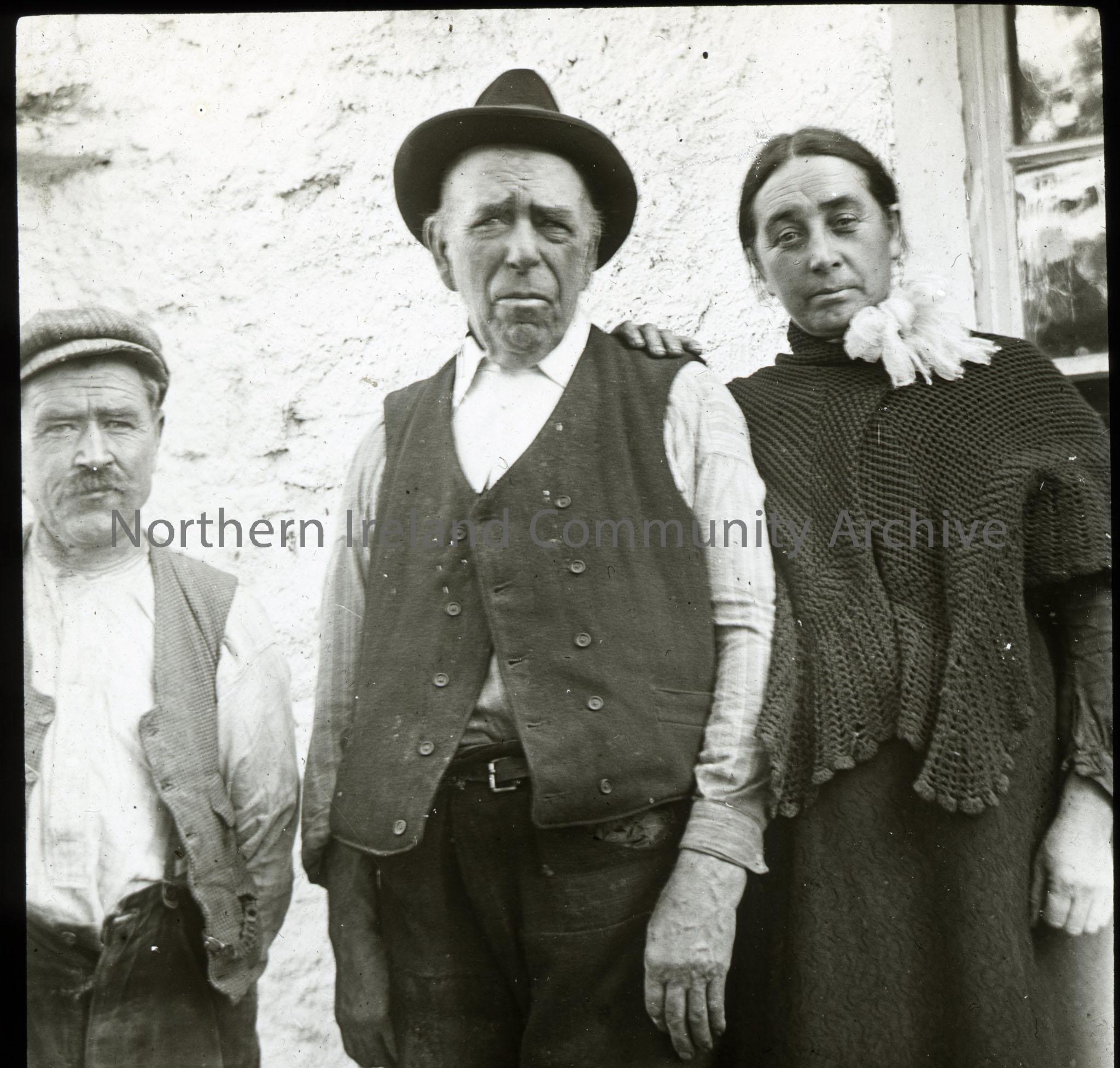 2 men and woman - W M McKane (centre), wife and daysman (JM - 1906, Lacht, west of Drumquin). See also - entry L:2010:1.217 and entry L:2010:1.554.1 Duplicate L:2010:1.577 also says at Laught as opposed to Lacht