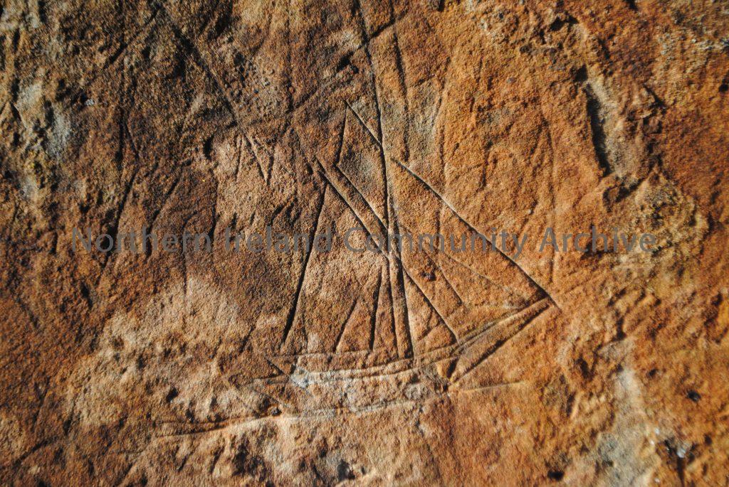 This is one of several unusual ship carvings scratched into the demesne wall behind Mount Druid. Their history and purpose is unclear, but the road that passes the wall used to be the main route to Ballintoy Harbour.