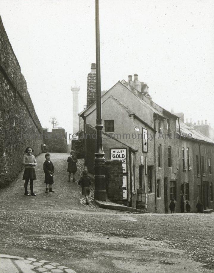 View of section of Derry's Walls and row of terraced houses - Walker Monument in background