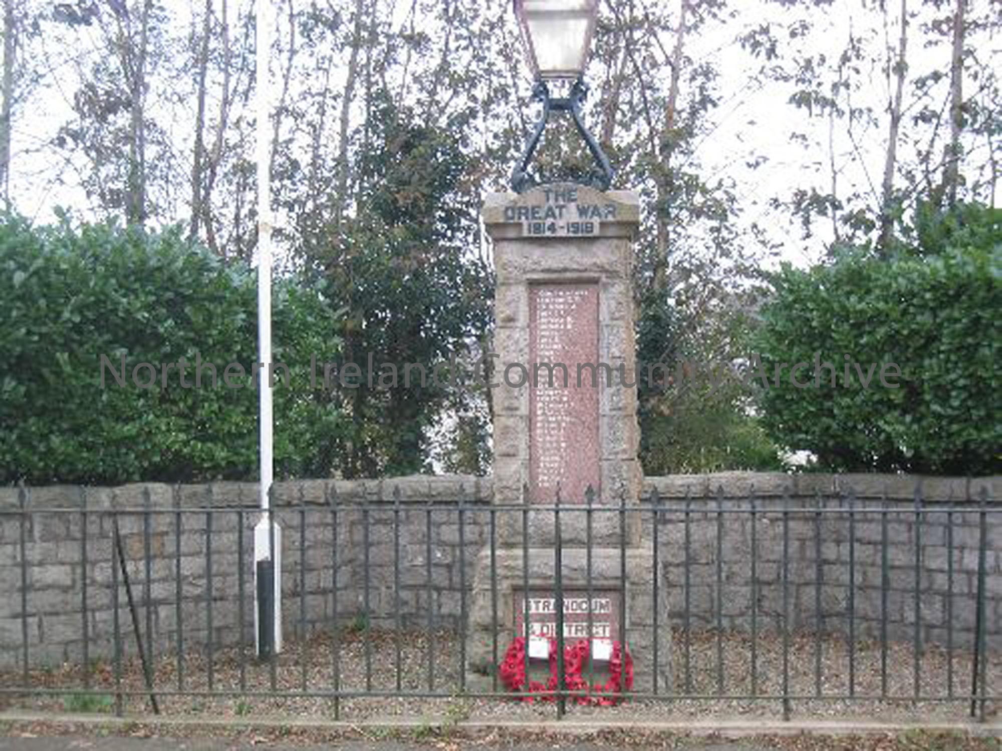 Stranocum War Memorial, probably the first to be erected in Northern Ireland following the First World War. The Memorial was in place by April 1920 and was paid for through local subscriptions.