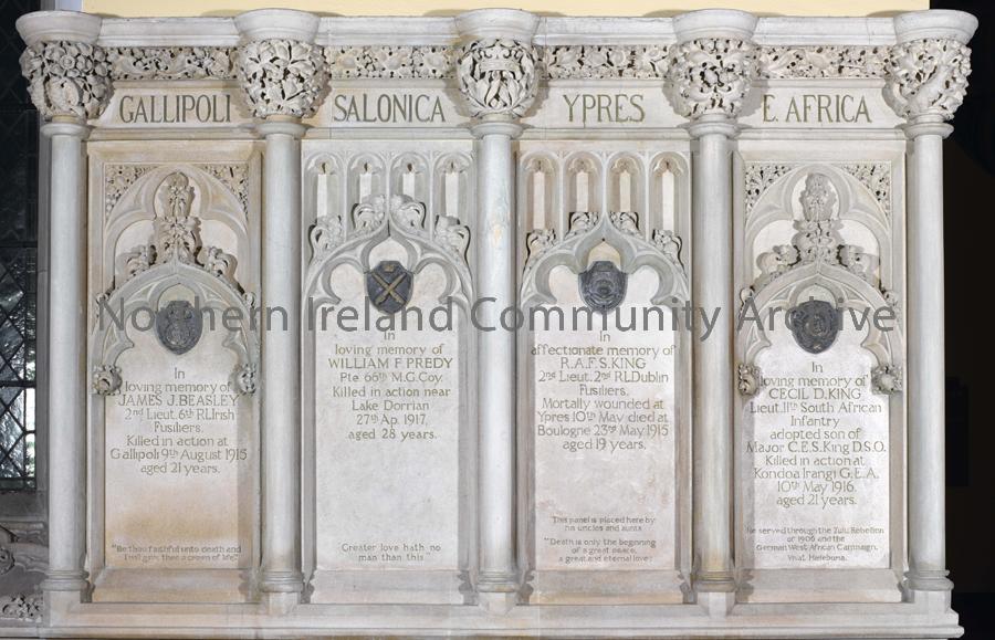 War memorial commemorating 2nd Lt. James Beasley, died at Gallipoli 9th August 1915, Pte William Predy, died near Lake Dorrian (Salonika) 27th April 1917, 2nd Lt. R.A.F. King, mortally wounded at Ypres, 10th May 1915, and Lt. Cecil King, killed at Kondoa Iangi (E. Africa) 10th May 1917.