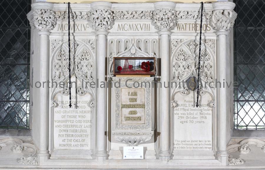 War memorial commemorating fallen from the First World War, and Lt Samuel Harrison in particular. Lt. Harrison died at Wattrelos, 29th October 1918.