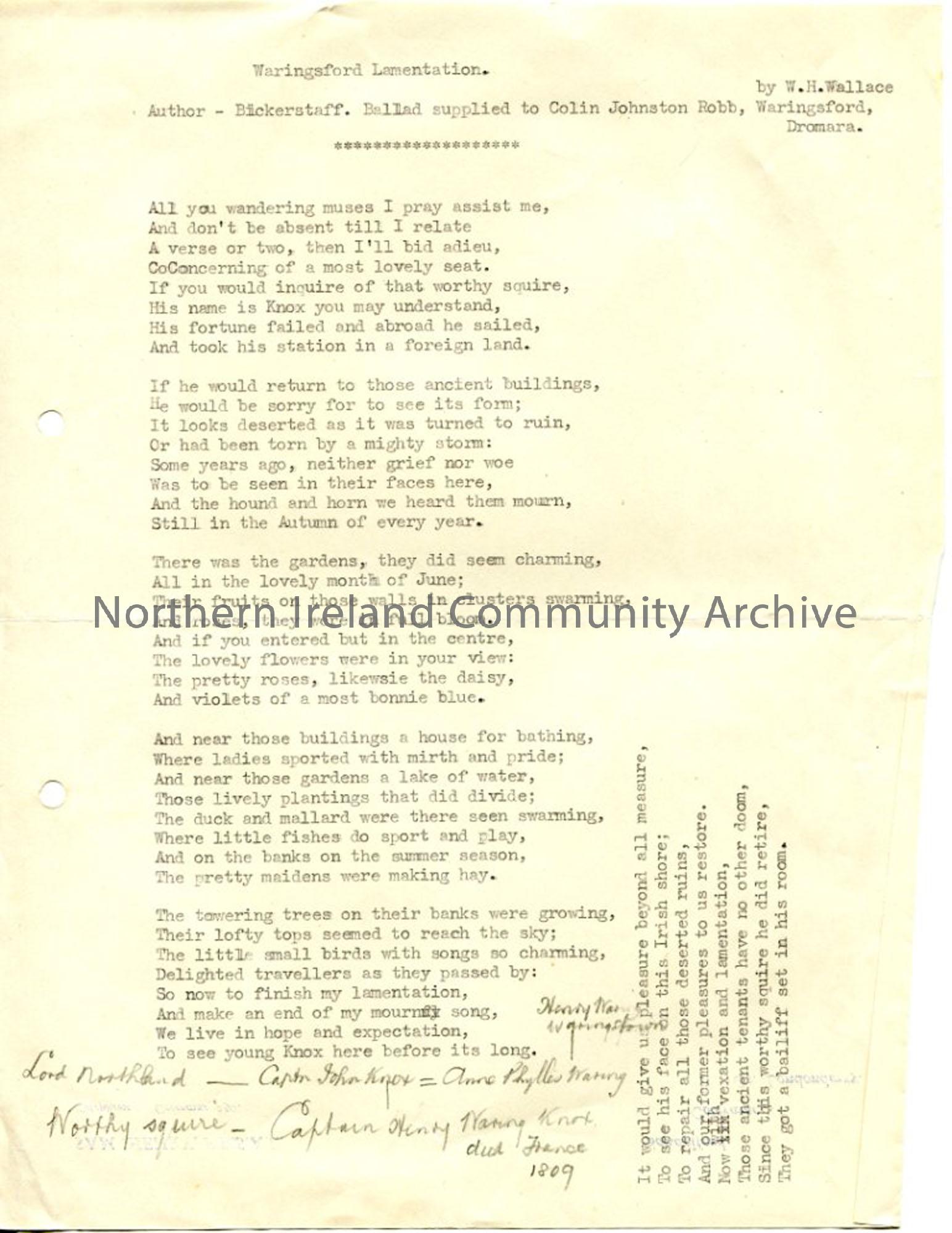 Typed words to 'Waringsford Lamentation', with pencilled in notes re family line of Knox. Author of song Bickerstaff. ‘Ballad supplied to’ Colin Johnston Robb. Ballad supplied by W H Wallace.