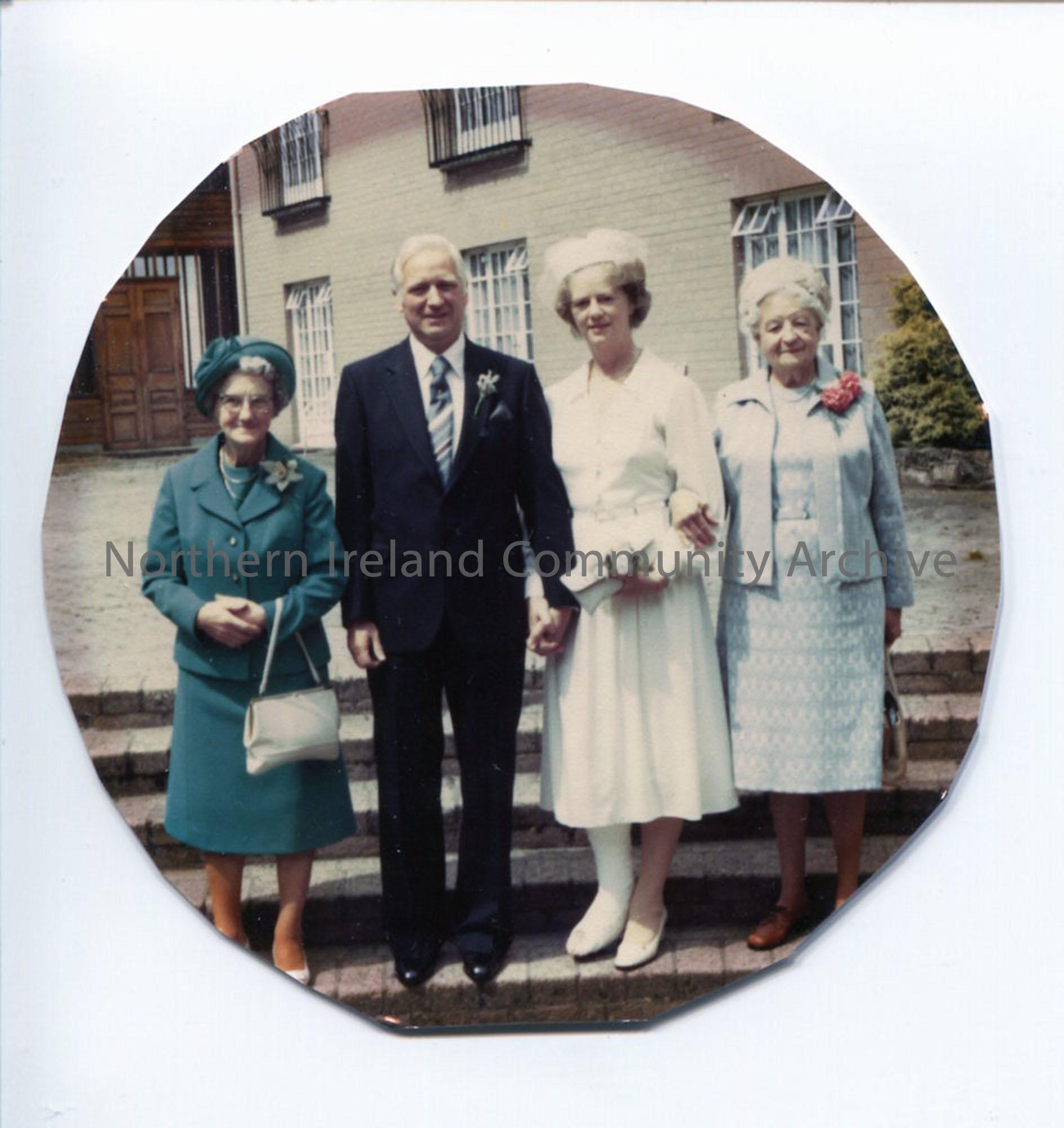 Wedding party of Ada and Don Elston, Bloomfield Presbyterian Church, Belfast, 27th June 1981. From let to right: Ada's mother, Anna Jordan; Don Elston; Ada Elston (née Jordan) and Don's mother Amy Elston.