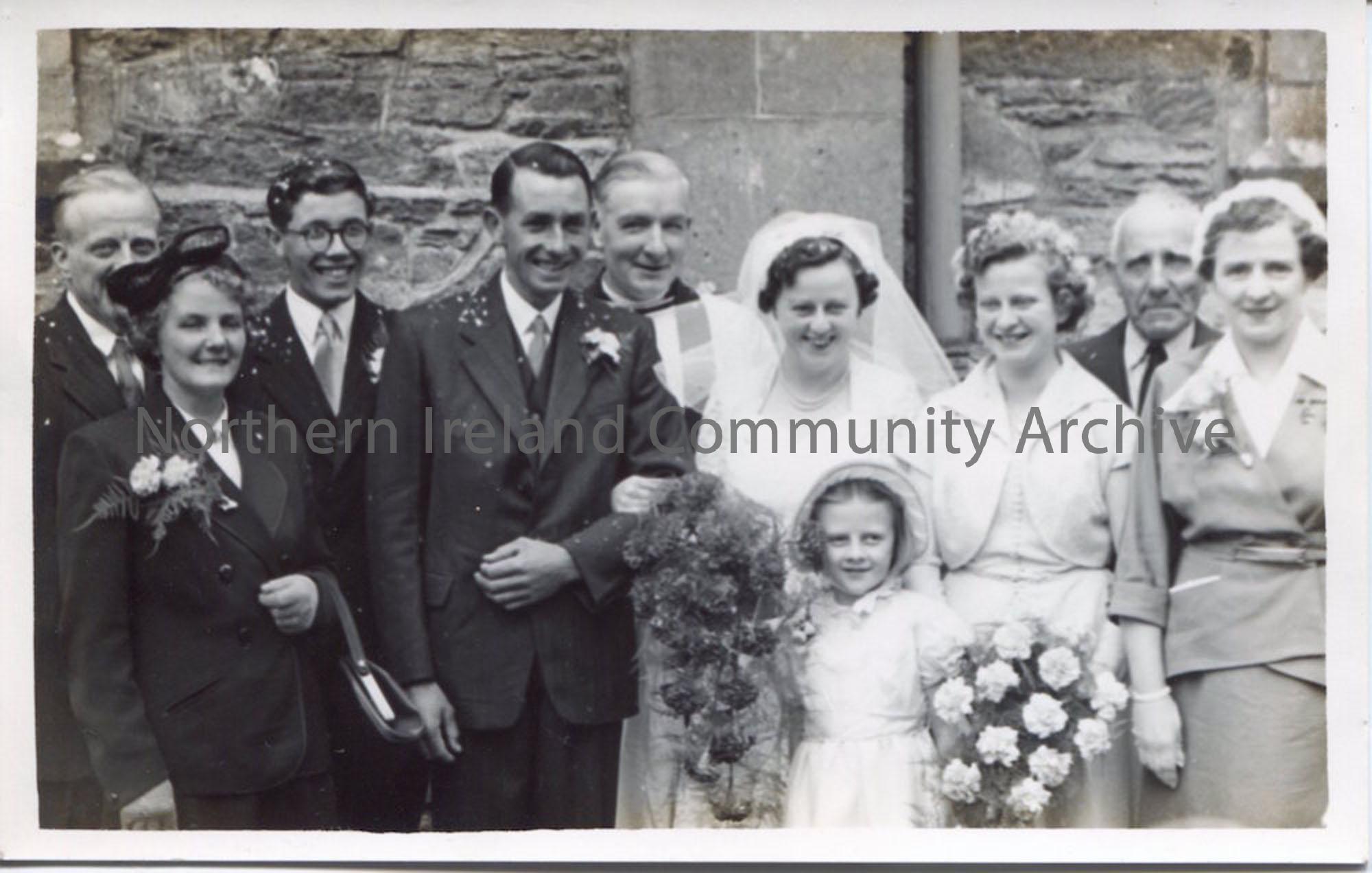 Wedding party of Edith and James Wilson, Carrick Parish Church, Limavady, 1954.