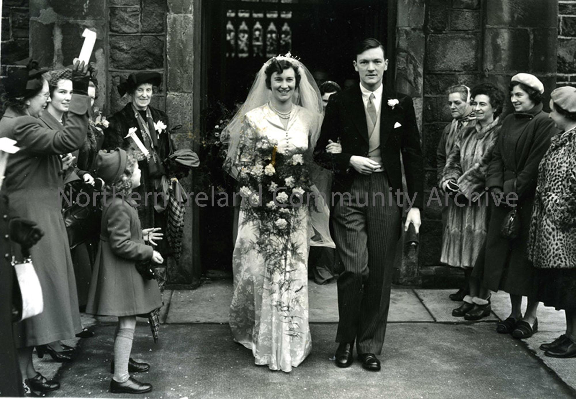 Wedding of Phyllis Maud Weir and William Thomas Ewing at Holy Trinity Church, Portrush on 1st February 1951. Phyllis wore an ivory embossed satin gown, a full length veil surmounted by a head dress of orange blossom. Her bouquet was of pale pink carnations.