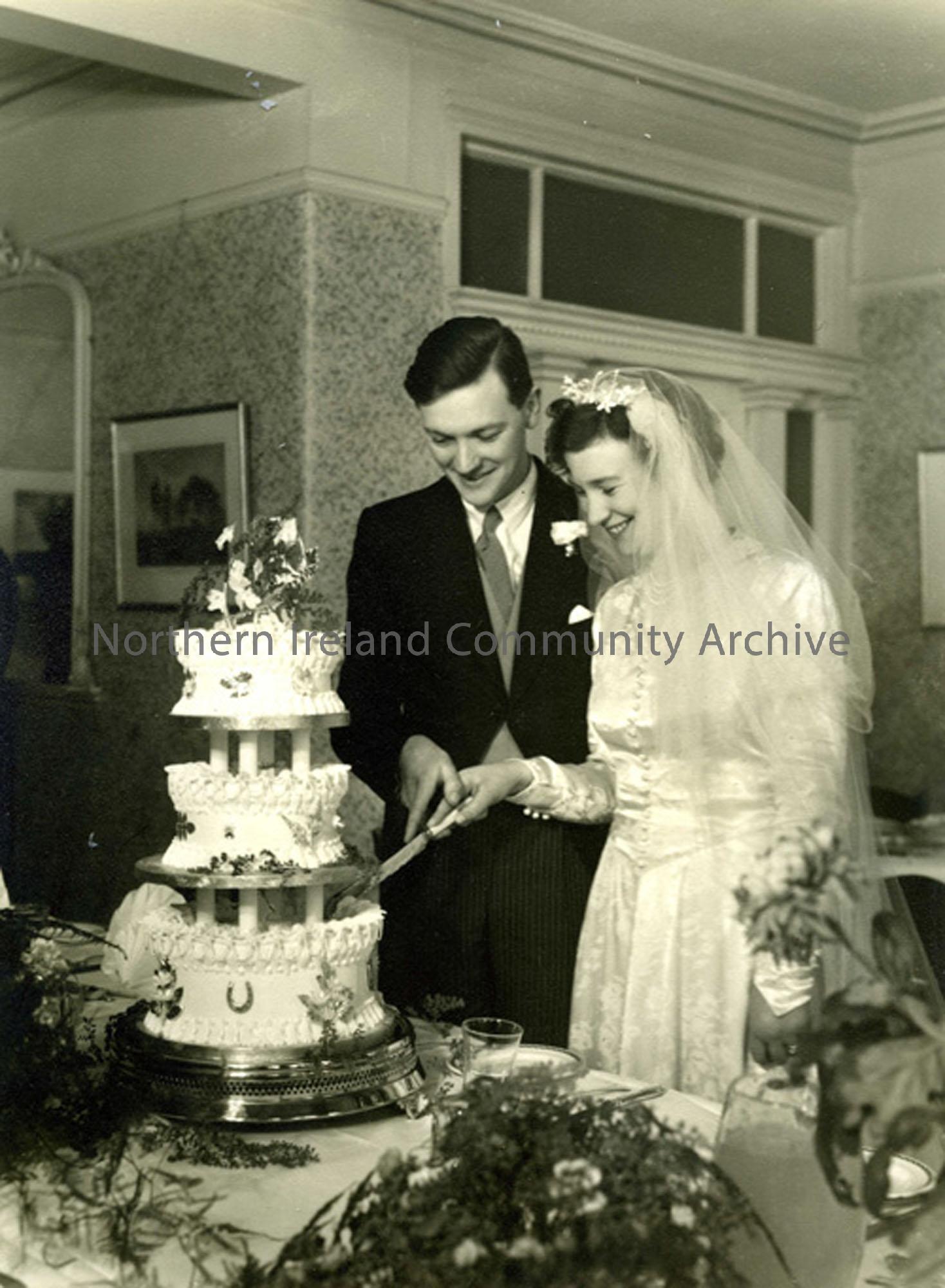 Wedding of Phyllis Maud Weir and William Thomas Ewing at Holy Trinity Church, Portrush on 1st February 1951. Phyllis wore an ivory embossed satin gown, a full length veil surmounted by a head dress of orange blossom. Her bouquet was of pale pink carnations.