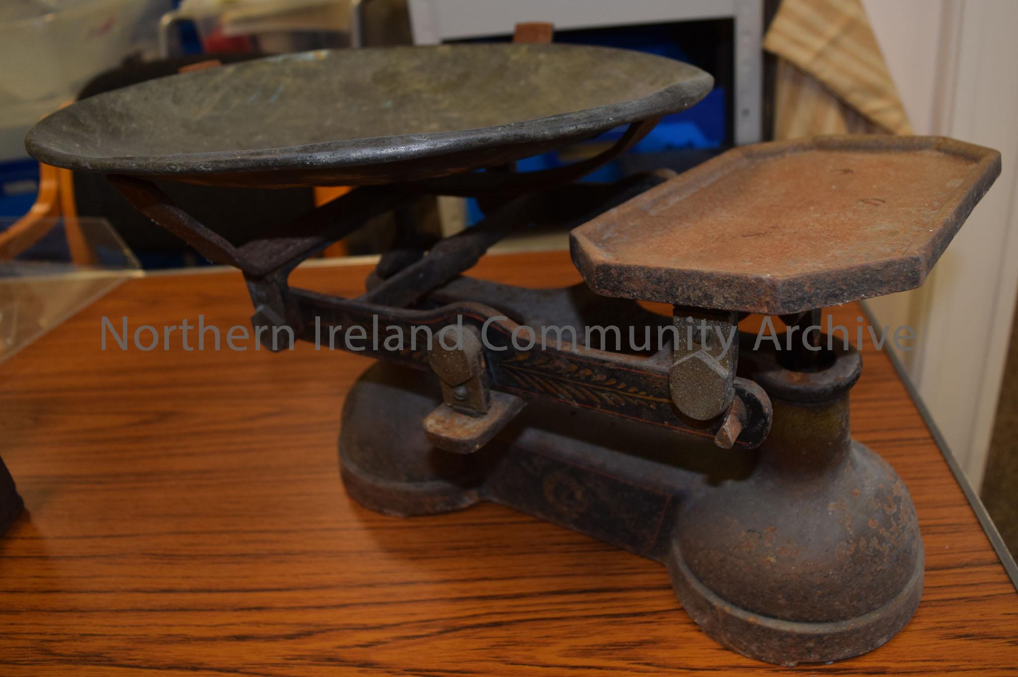 Weighing scales. Black with gold leaf design along the sides with a 8 sided rectangular platform for the weights and a large grey detachable circular dish for the object.