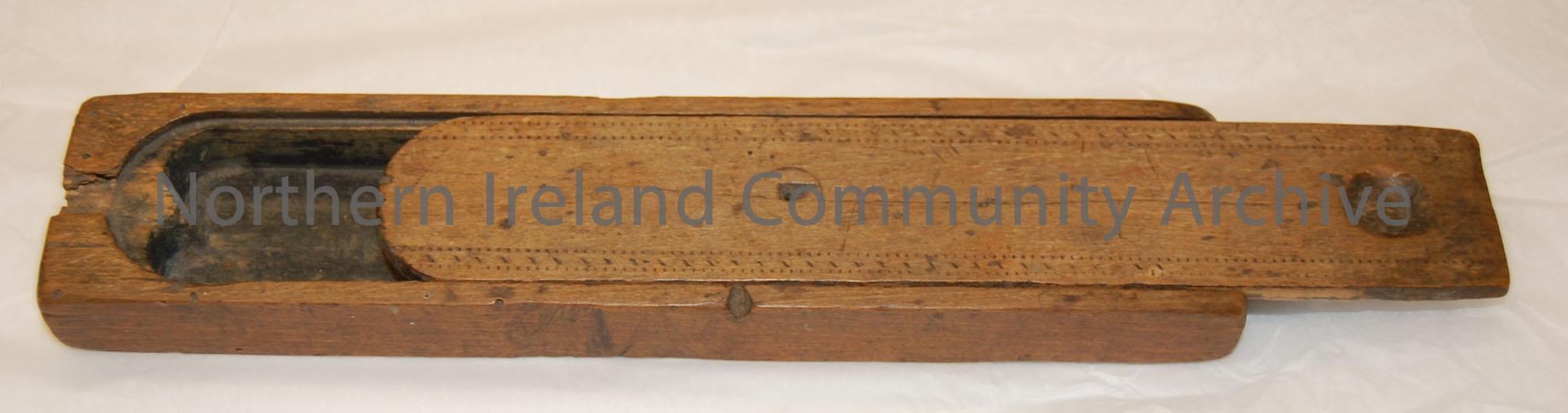 well used, home-made wooden pencil case, with decorative markings along top. Top panel slides out to open