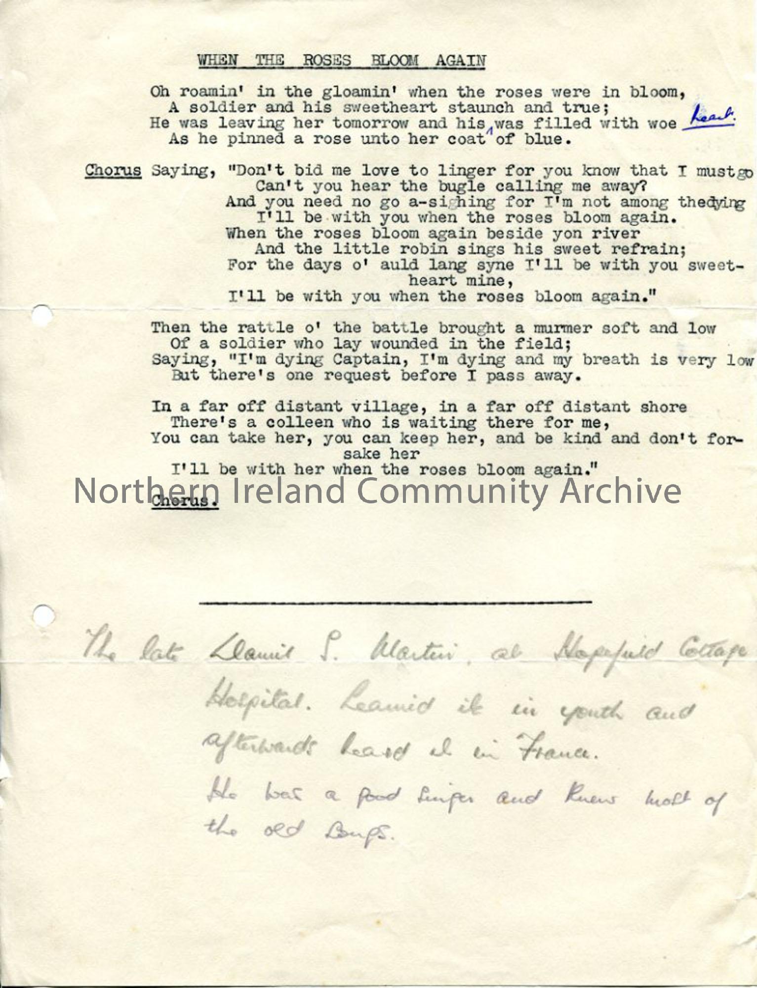 Typed words to 'When the Roses Bloom Again', with handwritten notes re ? donor and where he learned song. Uses local dialect.