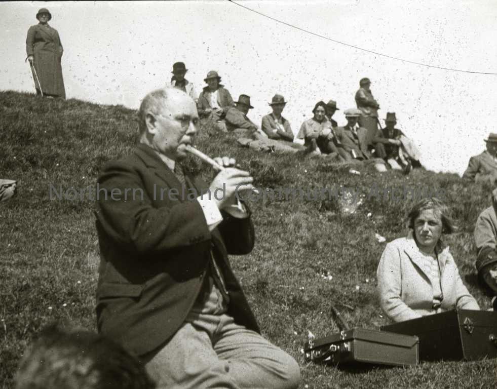 Man playing whistle on hillside with informal audience. (JM - the man playing is Sam Henry - probably at a Route Naturalists' Field Club outing on Rathlin, ?late 1920s or 1930s). Rathlin residents engaged through the Sam Henry Project (May-June 2017) believe the photo to have been taken at Ushet Lough.