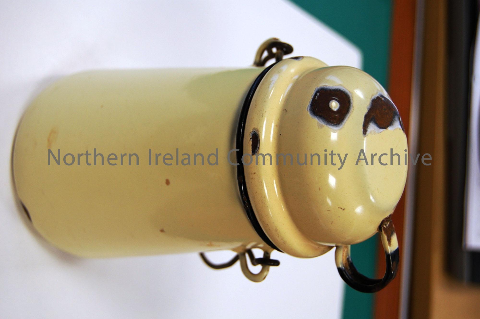 White Billy can with lid. Used by farmer’s wife to bring milk into the house.