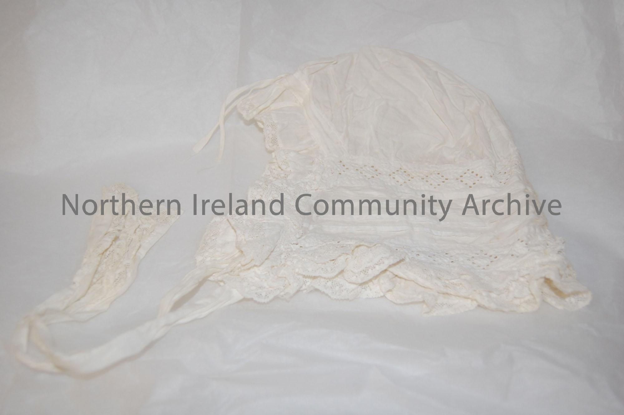 White linen Edwardian bonnet. Has two ties for around the neck.