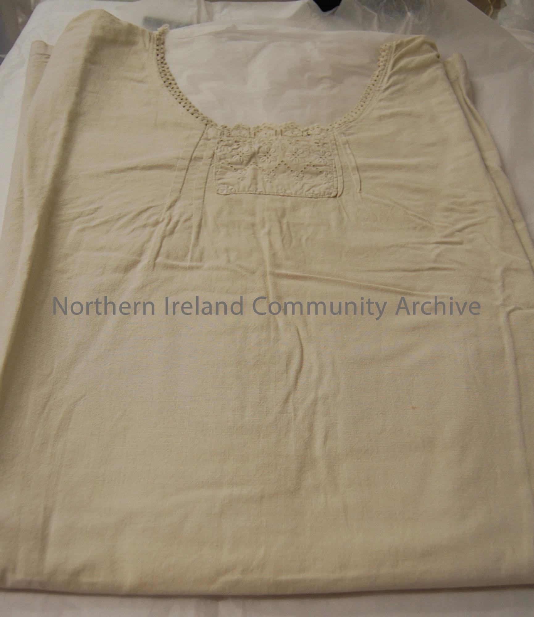 White shirt sleeved nightdress with flowers stitched at the front below neckline.