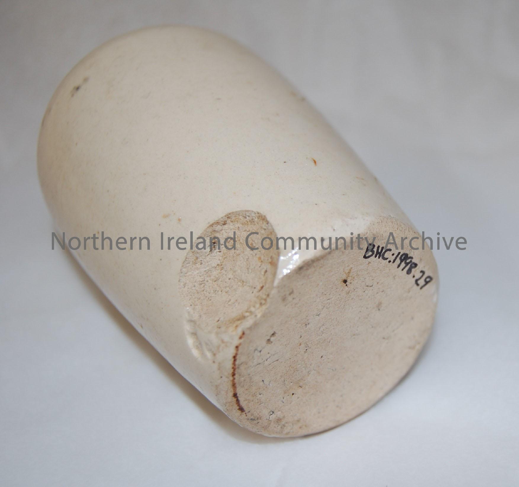 Wigtownshire Creamery Jar. Recorded as E23 in the Town Hall Collection; transfer reads “Pure fresh cream from the Wigtownshire Creamery co. Ballymoney… – 1998.29 (2)